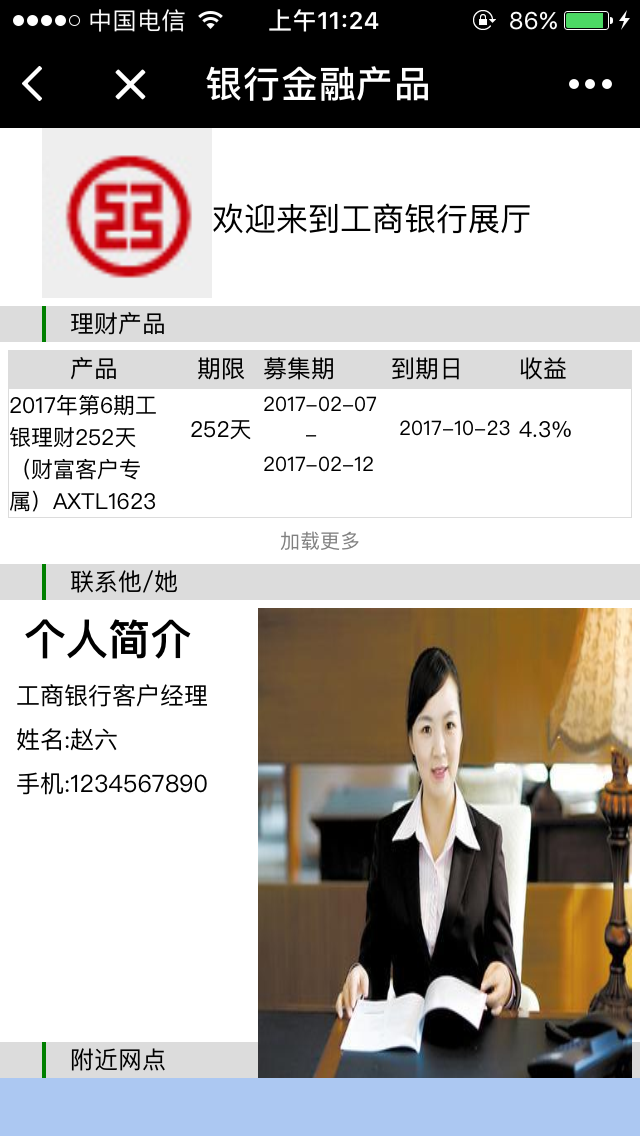 1银行理财产品展示 2附近网店的查询 3银行客户经理联系方式。 保证所提供的咨询的完整和准确,但绝不涉及银行相关业务和交易