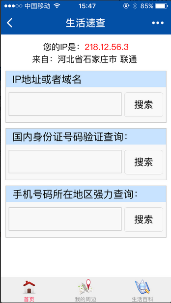 生活助手,随身生活查询小工具,包括:手机号归属地查询、身份证归属地查询、IP地址归属地查询、周边查询、菜谱查询、常用药品说明书查询等。