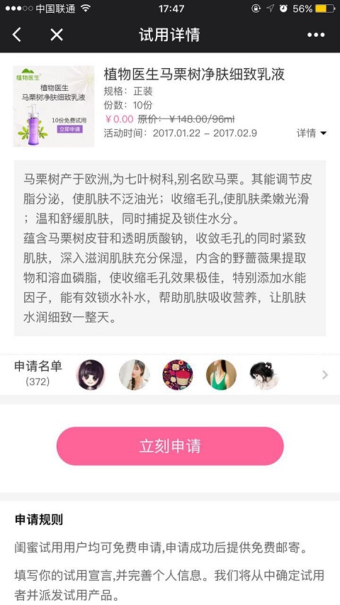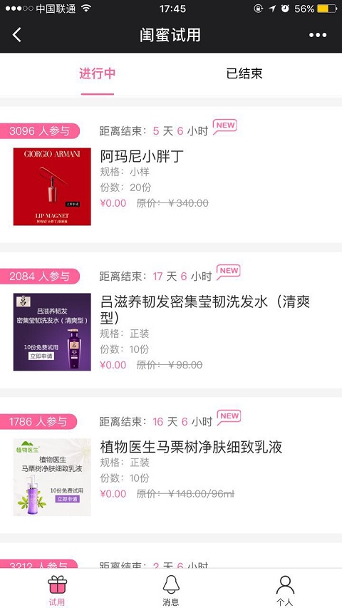 最新大牌化妆品免费试用平台。挑选感兴趣的产品,参与申请就有机会获得。参与试用告诉我们你们的口碑评价,赢取更多试用资格。