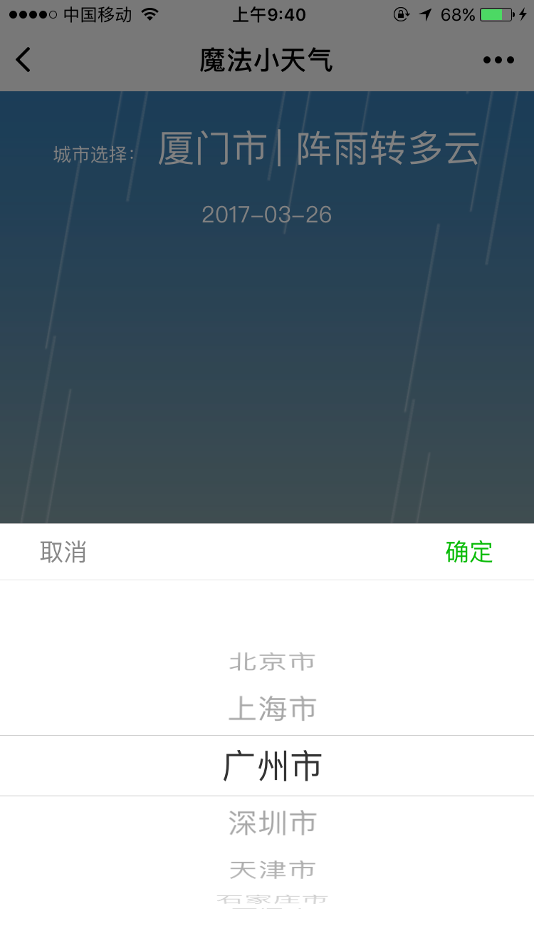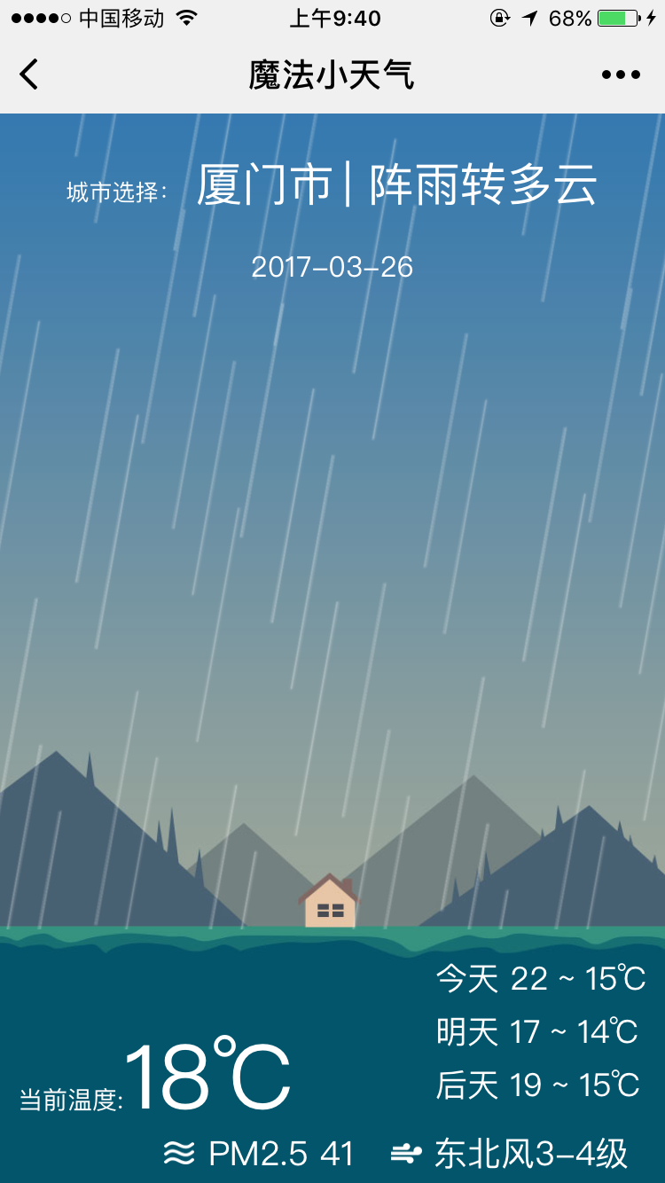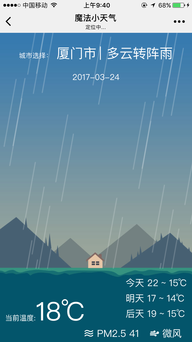 用户可以方便获得当前所在位置的天气情况,包括温度、天气、风俗pm2.5等。目前显示三体的天气情况。