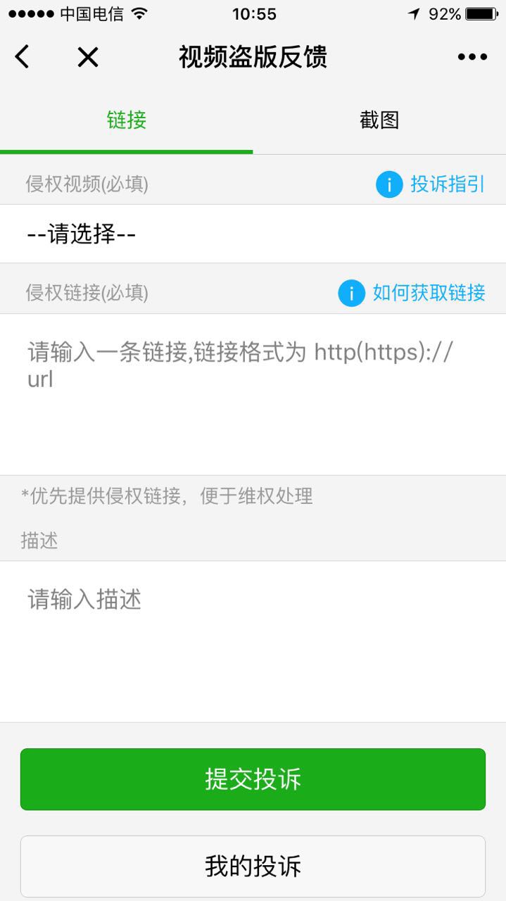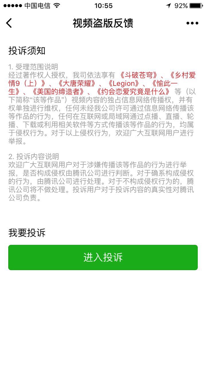 公益性投诉平台,支持举报未经腾讯视频授权、通过信息网络传播腾讯视频独占网络传播权视频作品的侵权行为。