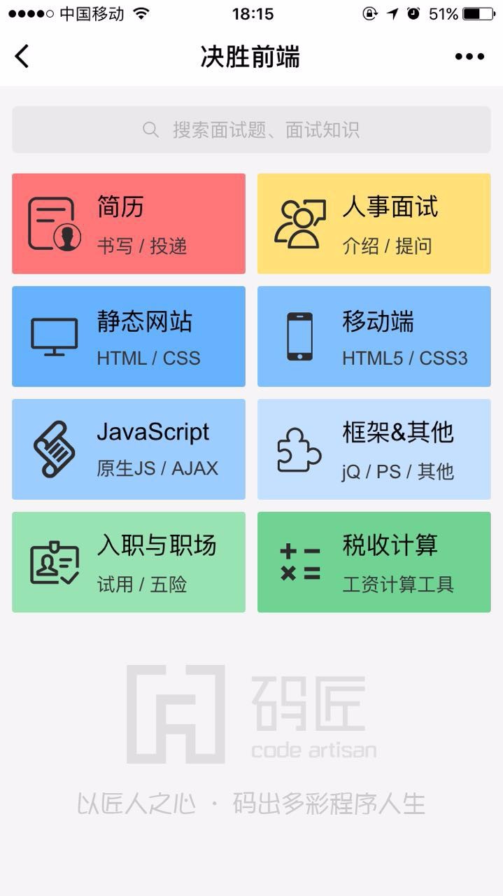 为您解决“简历制作、投递、人事面试、技术面试、入职与工作”中的疑问,分享职场相关知识和感悟,让我们一起决胜前端!—码匠