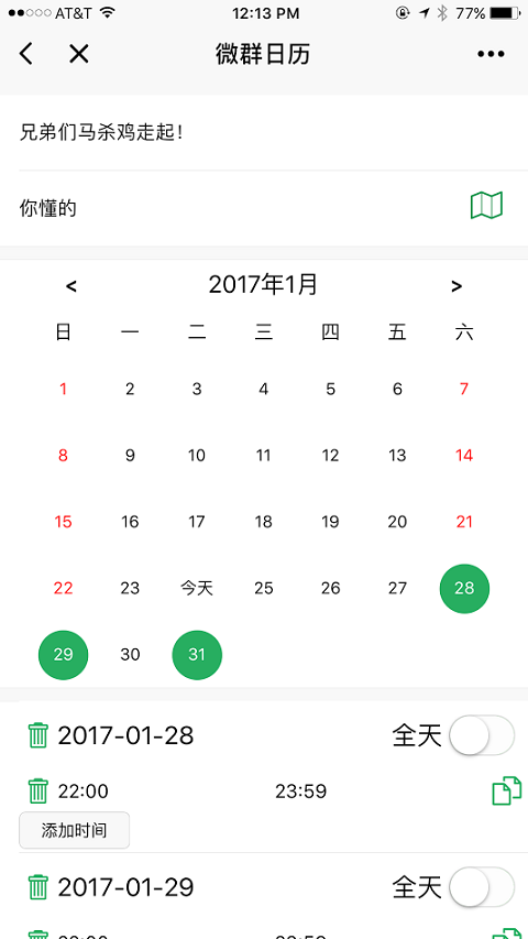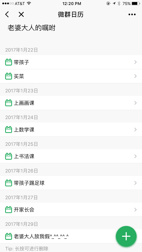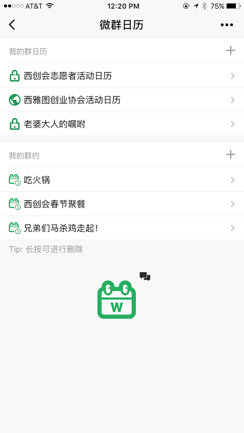 微信共享日历。私密日历只有指定成员可见,公开日历则能被别人发现。微信群约饭约活动的神器,特别是微约的功能。