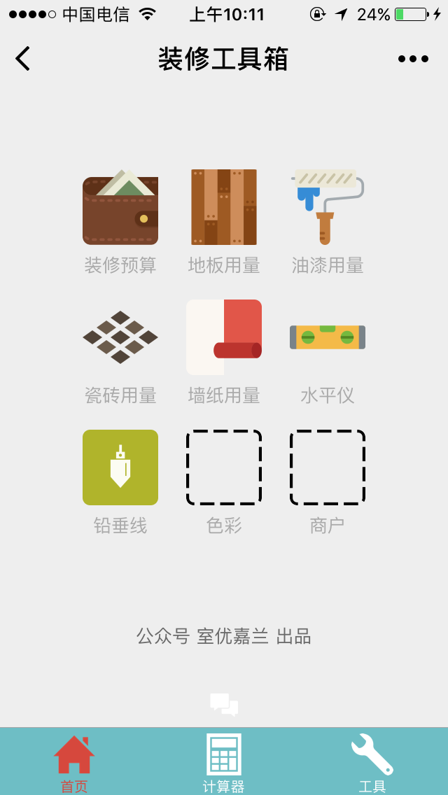 装修工具箱中含计算器及水平仪。计算器可估算装修预算及地板、瓷砖、油漆、壁纸等用量,水平仪用来查看直线垂直及平面水平程度。