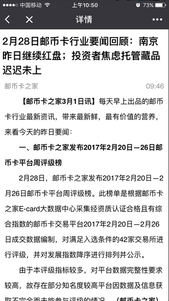 邮币卡之家是国内领先的交易市场第三服务平台。为电子交易市场参与者和第三方服务机构提供及时行情、资讯、公告等内容。