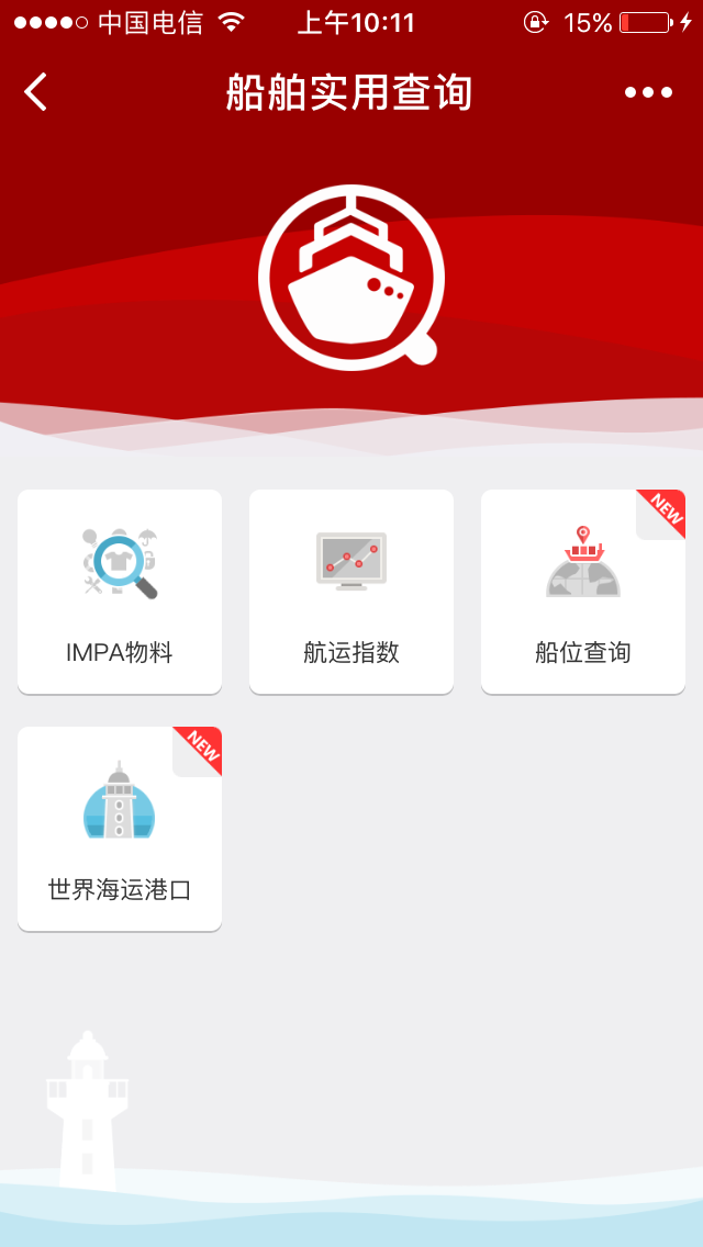船舶行业相关的各类实用查询工具,主要提供IMPA物料查询、BDI等航运指数、船舶定位、近海天气,全球海况等航运公共信息查询服务。