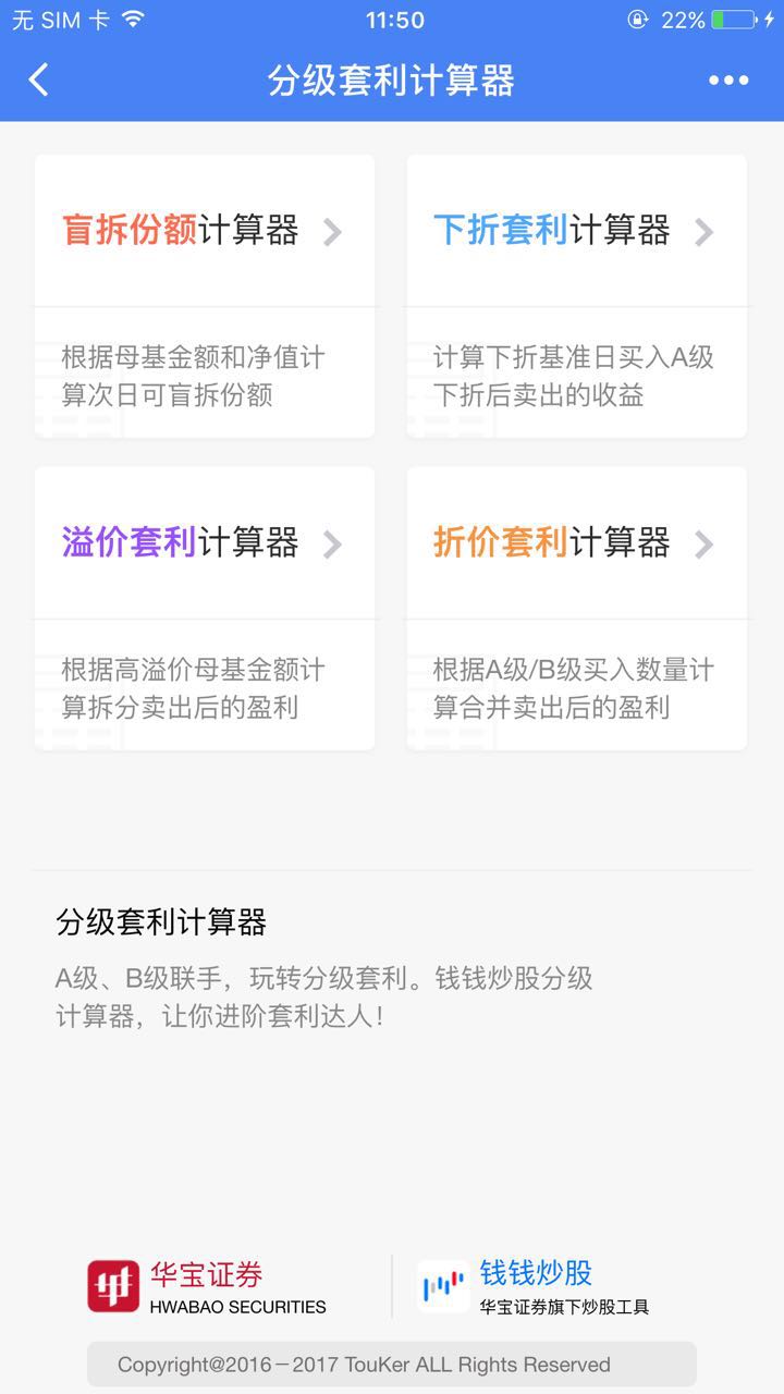 华宝证券分级基金职能套利计算器,可帮投资者快速验证分级基金拆分、合并等套利侧罗,及时寻找投资机会。