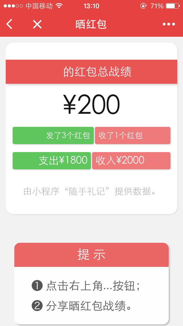 往来有礼,随手一记!随手礼记,让你方便快速的记录亲朋好友间的人情往来,如生日、结婚、拜年等所送出和收到的红包礼金账目。并能将红包战绩分享给你的微信好友和微信群。2017年,你拿了多少拜年红包?赶紧晒出来!