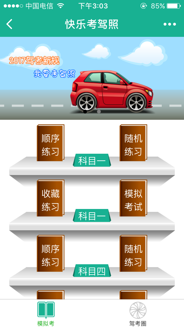 考驾照新题库,智能学习;科目一、四:顺序,随即,收藏复习,模拟考试;科目二:直角转弯,倒车入库,侧方停车,S弯行驶,坡点起步。