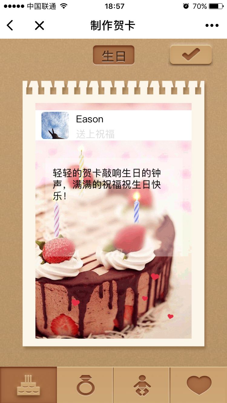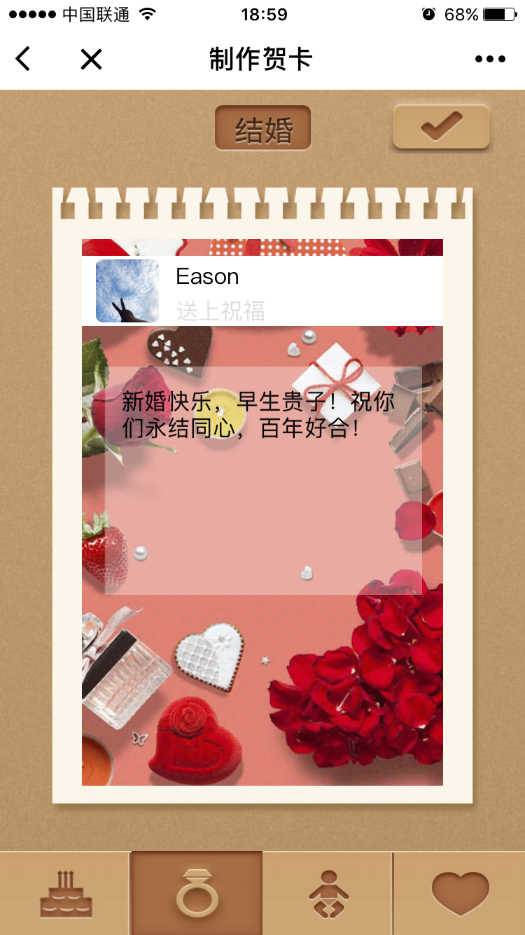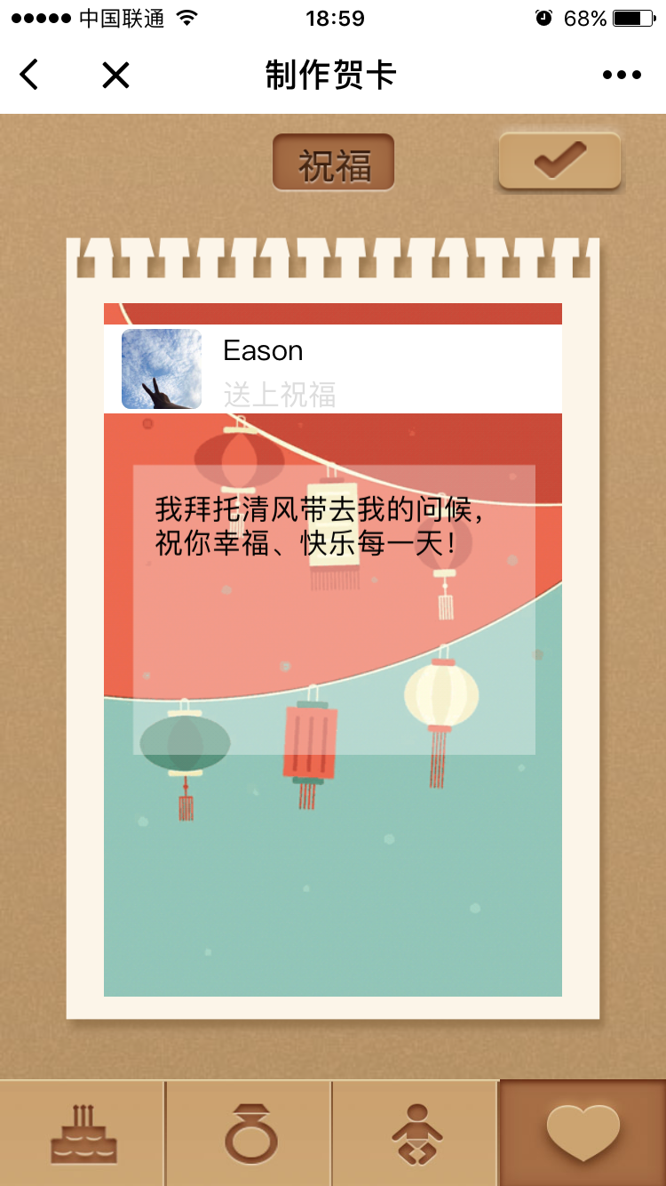 在这里,你可以制作精美的电子贺卡(结婚/生子/生日/节日等),为你的亲朋好友送上美好的祝福,并把这些美好的祝福珍藏起来!