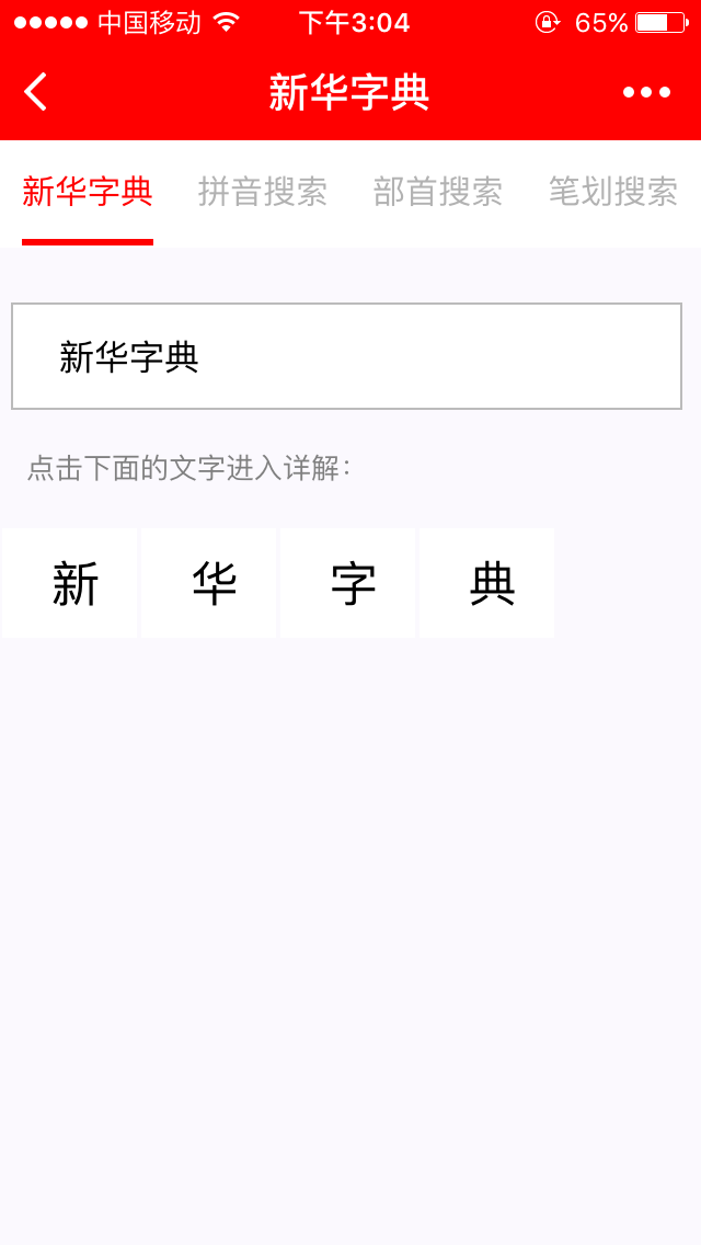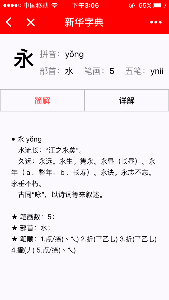 收录两万多个汉字,可按部首、拼音、文字、字的总笔画查字,可查到字的五笔、读音、含义、组词、词性、英文翻译、出处等。