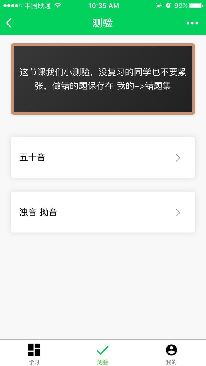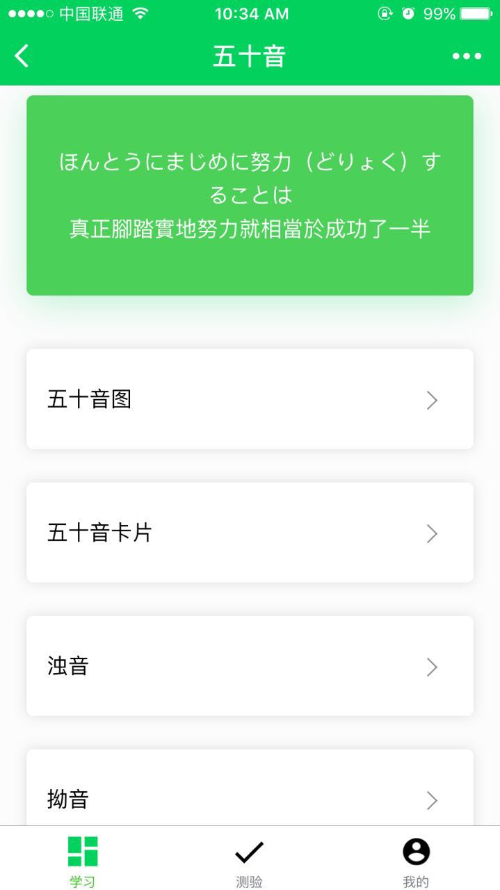 帮助您学习日语五十音,带发音功能,还有方便的小测验功能,帮助检验学习成果。