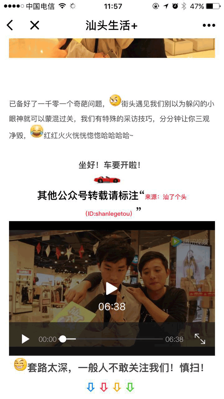 「汕头生活+」是第一款服务于区域自媒体的小程序,在这里你可以了解第一手的汕头新鲜事,浏览纯正的潮语搞笑视频,与潮人圈子的你我他激萌互动! 「汕头生活+」依靠于区域自媒体小程序平台 -- 海螺云(hailuoyun.cn)。海螺云致力于帮助公众号主以零技术的投入切入到小程序中,丰富小程序的生态,微信:dawnsail。