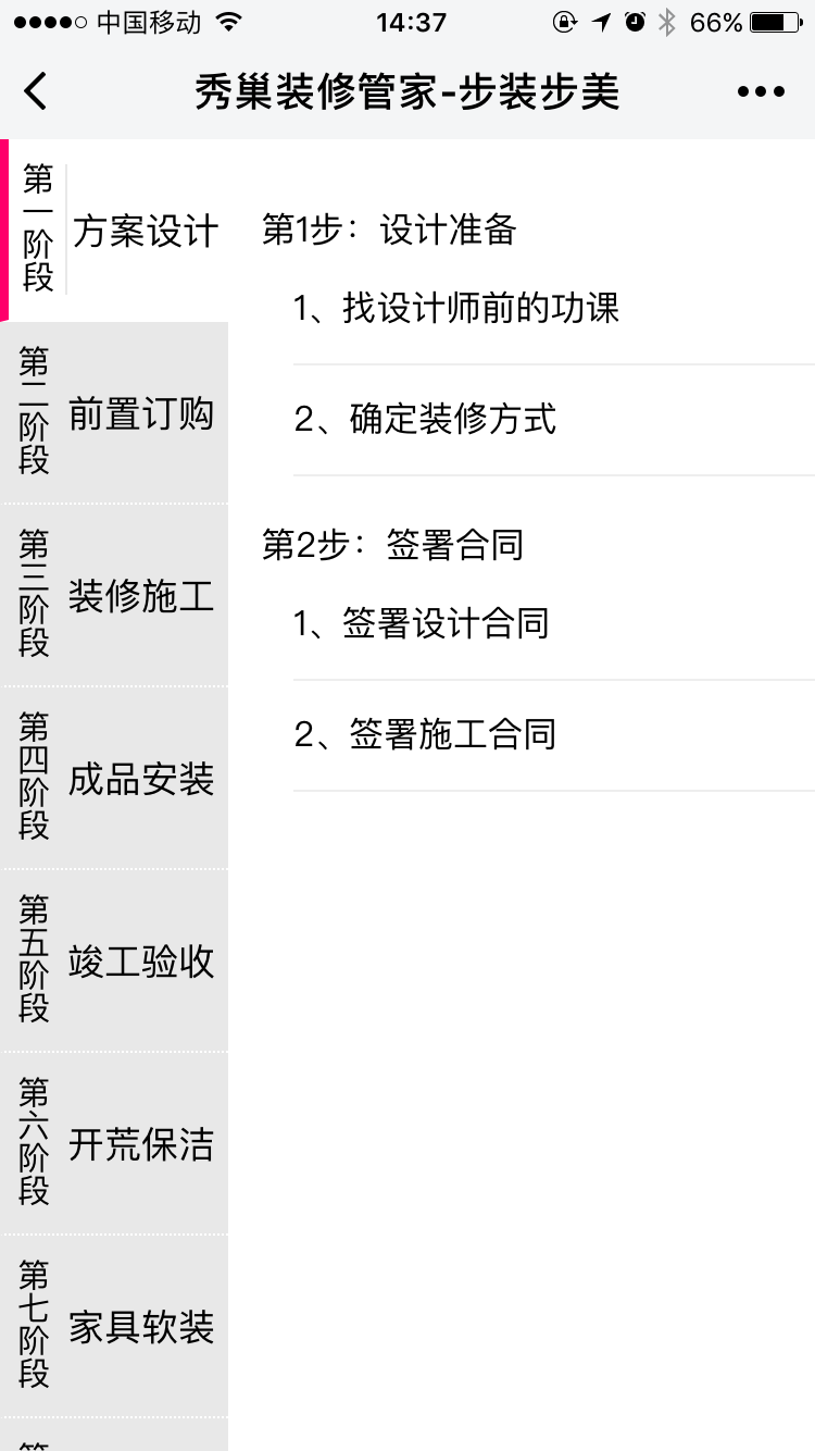 秀巢装修管家,能帮助业主按施工流程实现完美的装修,共分为8阶段 45步,包括施工规范、验收标准、交叉施工项和材料订购攻略等。
