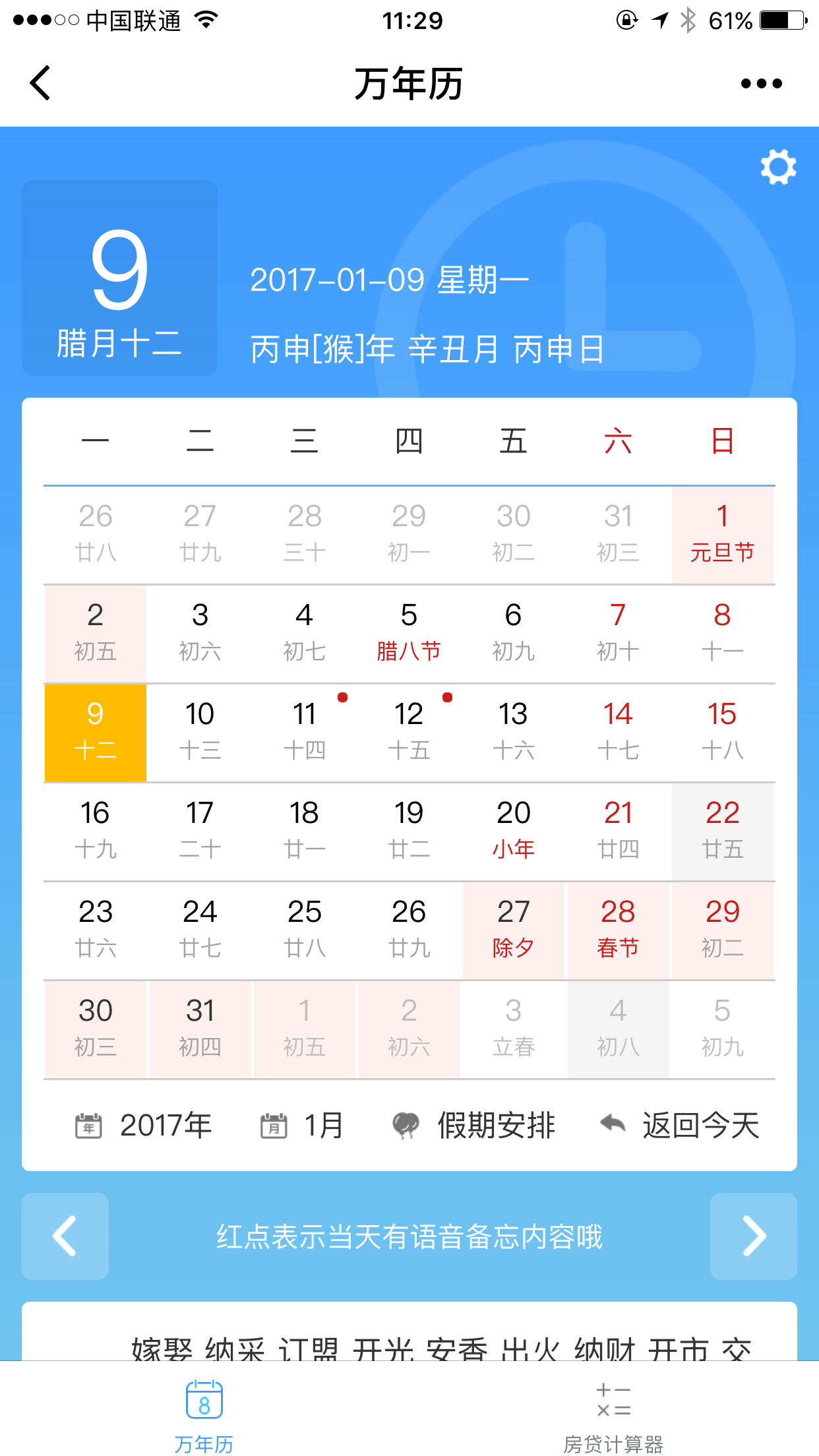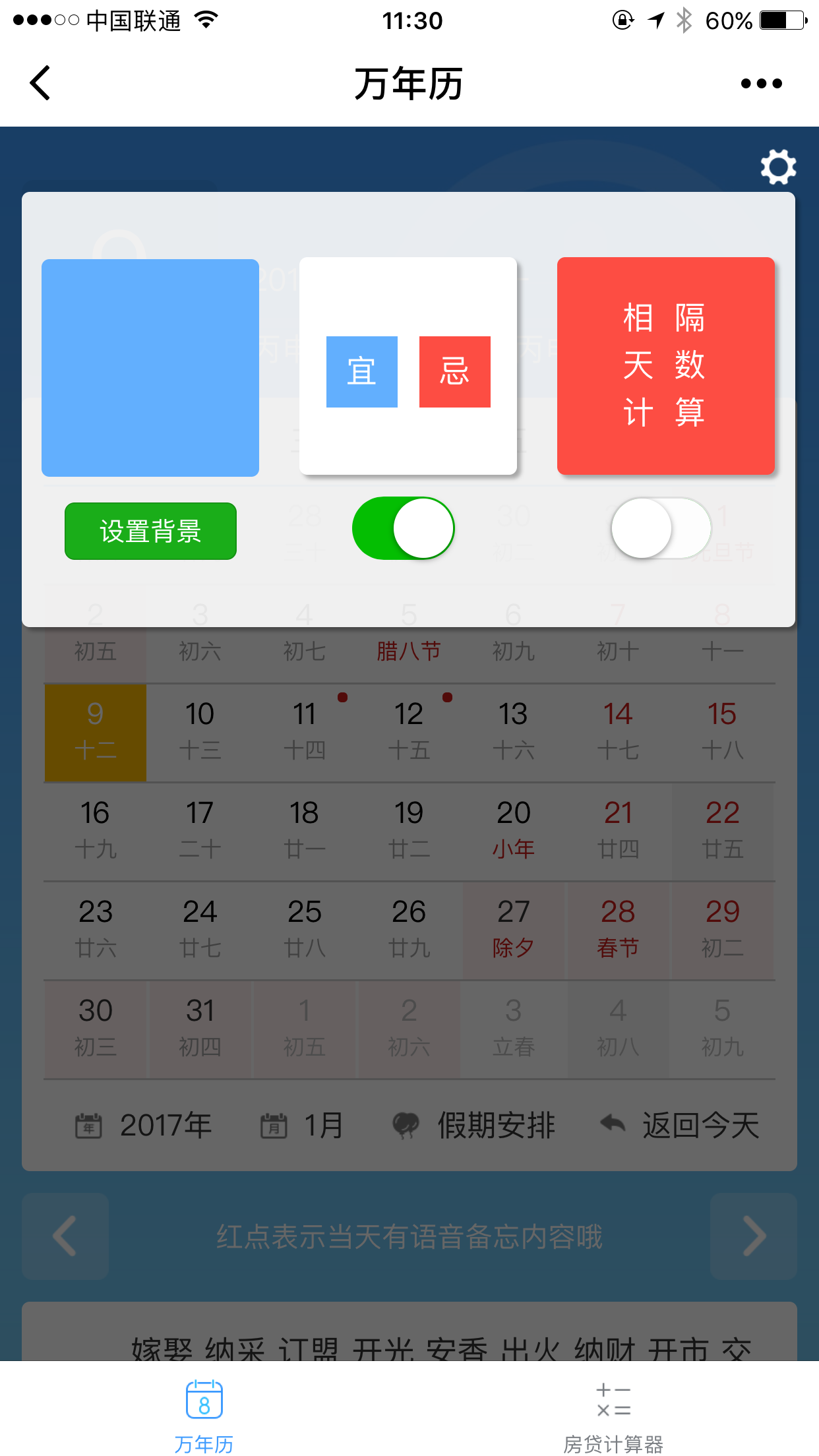 提供万年历查询,天干地支信息,语音备忘功能及相隔天数查询;提供房贷计算器可方便查询贷款额度及月供金额等信息。