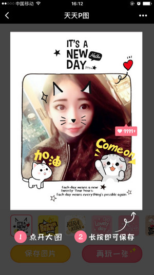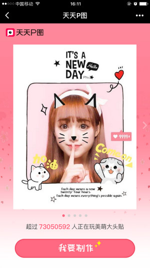 天天P图小程序是由深圳市腾讯计算机系统有限公司研发推出的小程序,能够一秒钟将你的照片变成美萌萌的大头贴。   进入天天P图小程序之后就直接点击下方的我要制作,你可以选择现场拍照,也可以选择从图库里面找出一张更美的照片,选好之后再挑选你喜欢的框架,然后点击保存图片就能分享给你的好友了!