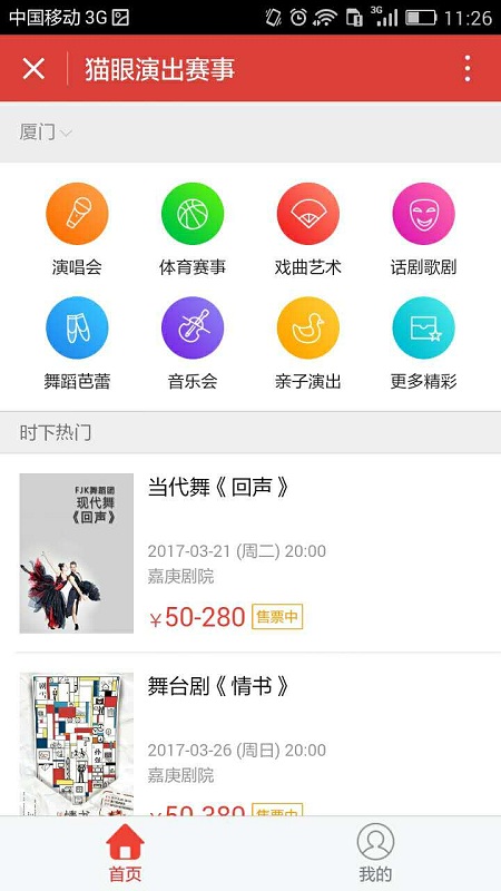 提供最丰富的演出信息介绍,可方便的查询购买多个渠道的演出票。演出赛事一网打尽,精彩生活现在开始~