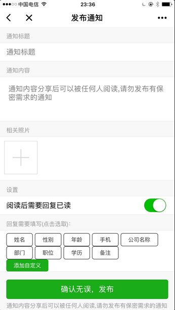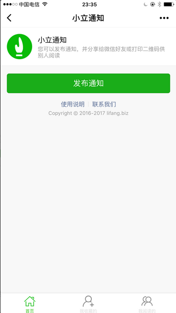 用于发布通知公告的小程序,用户发布通知后分享好友阅读,并可以跟踪已读情况。