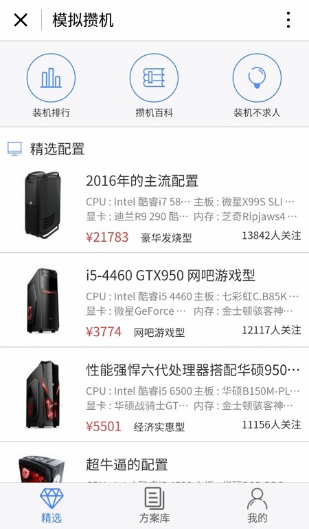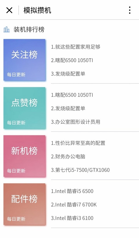 ZOL模拟攒机提供实用的自助虚拟装机平台,为用户推荐精选配置,便于用户筛选、收藏个性方案,浏览热门排行、装机教程等讯息。