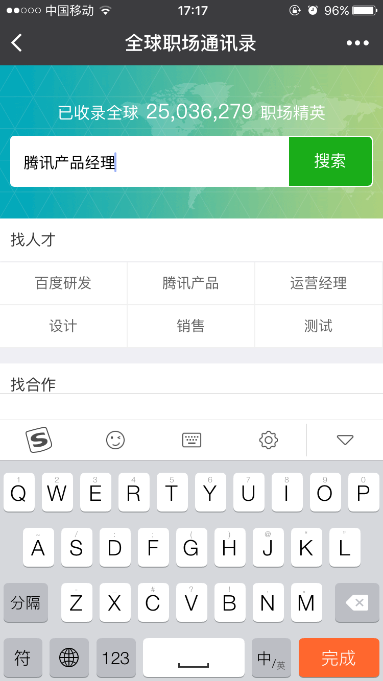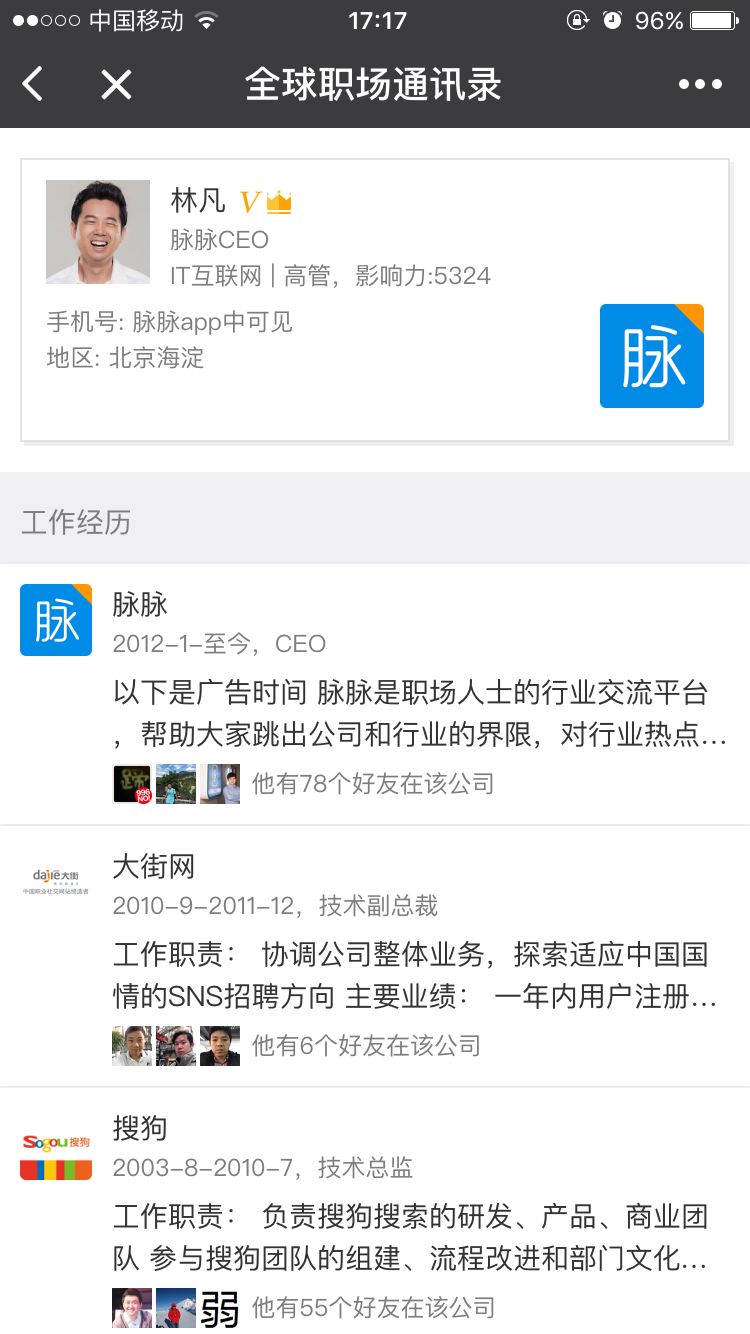 全球职场通讯录是职场小程序,极速找同行牛人、找人才、找合作、找投资,帮你解决职场难题。找人再也不用疯狂跑会,托关系,陌生拜访了,打开微信就可以轻松获取人脉。