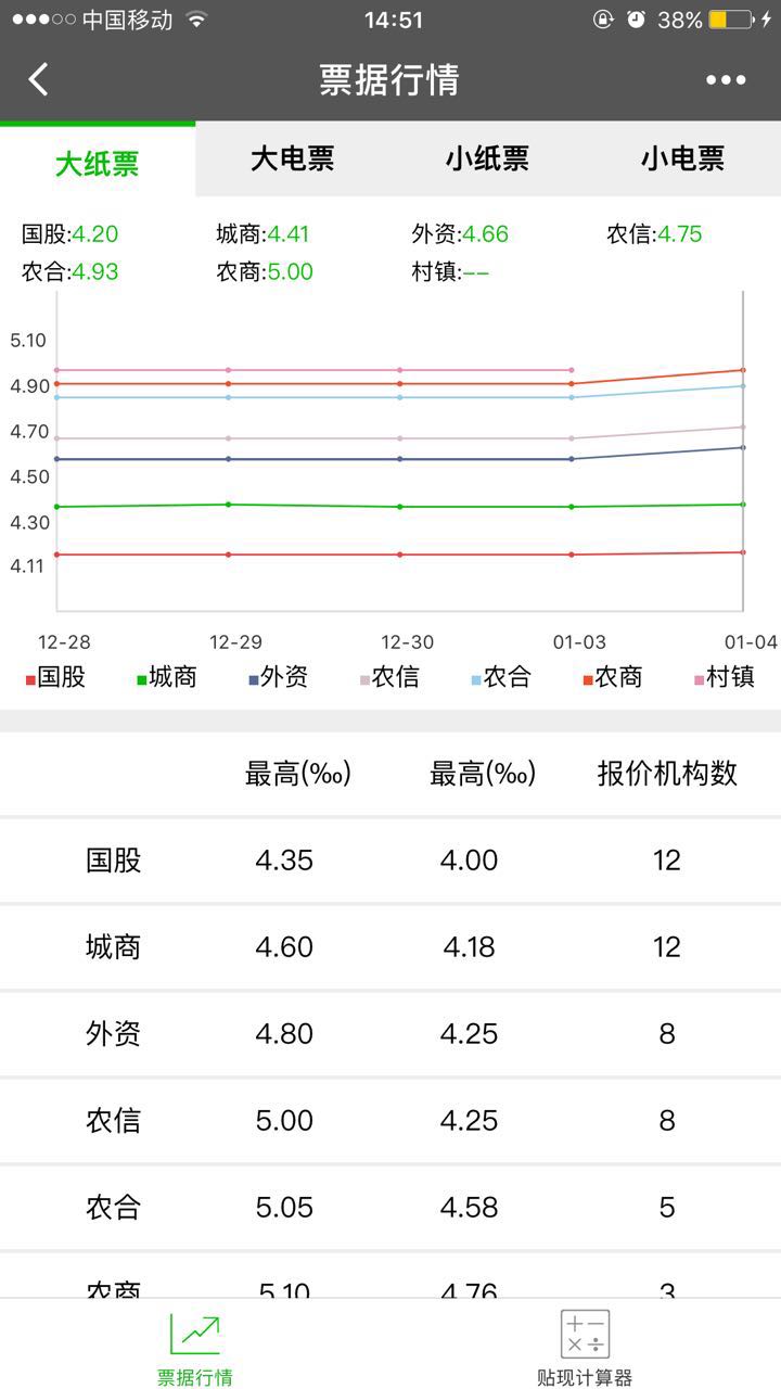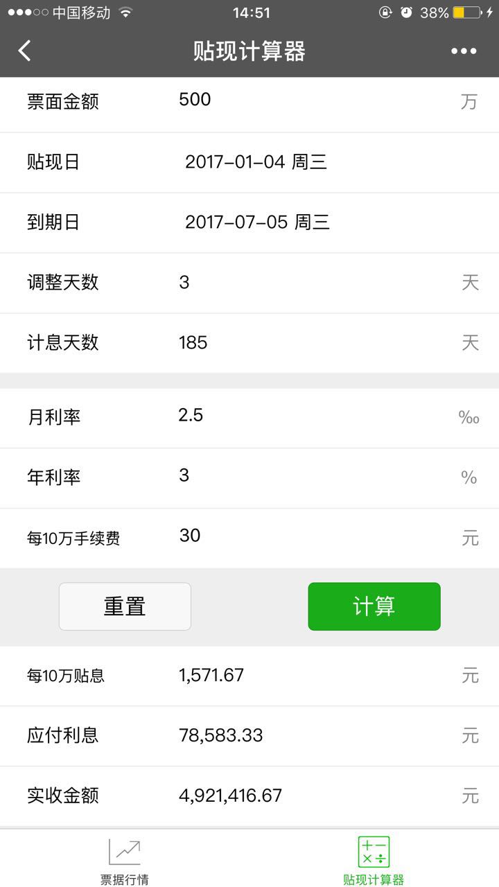 覆盖全部票据种类,实时呈现票据市场行情走势,显示最高最低价格。票据贴现利率计算器,年息月息自动转换,一键得出贴现利息。
