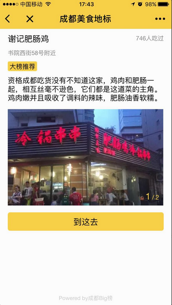 由「成都big榜」公众号专业编辑,亲身肉测挑选出来的500多家成都本地代表美食。特别适合本地吃货和外地来成都旅游的朋友,陪你在成都的街头走一走,吃一吃。最具发现眼光的城市生活指南。