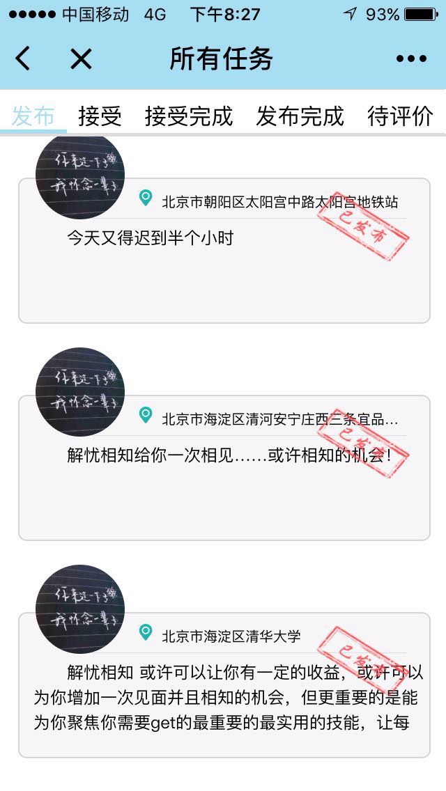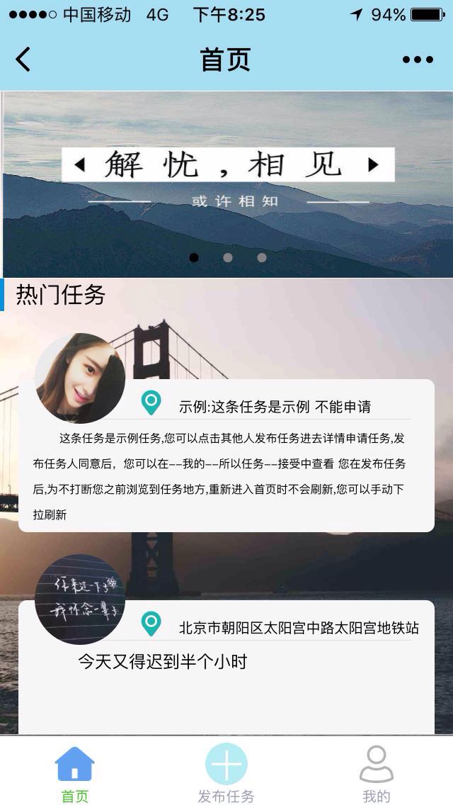 在生活中遇到棘手的需要解决问题,可以找附近人帮助 ,发送附近任务,附近人看到可以帮助解决,这个小程序旨在让人们之间的资源达到合理的利用!