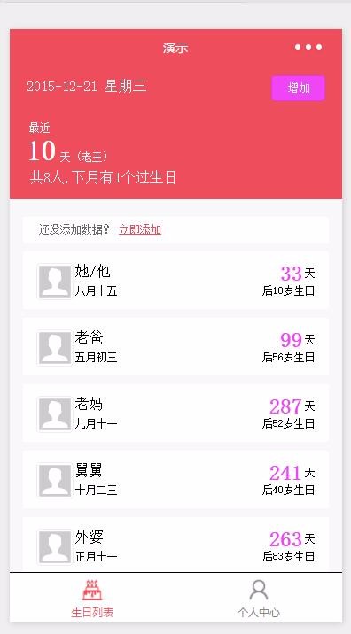 生日工具是一款生日提醒软件。 使用生日工具可以方便地管理父母、亲戚、同学等人生日,并设置时间。支持选公历显示农历功能。工具每天云端数据备份保证您数据的安全,小程序夸平台使用,使您再也不会担心忘记朋友的生日。