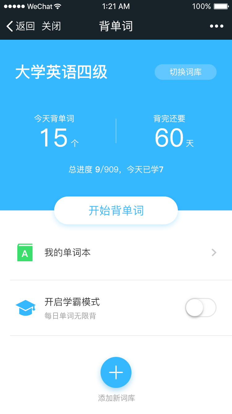新东方在线官方推出的背单词小程序,每天斩获15个单词,轻松掌握单词奥义,还有学霸模式随心斩。现有大学英语四级和六级词库。