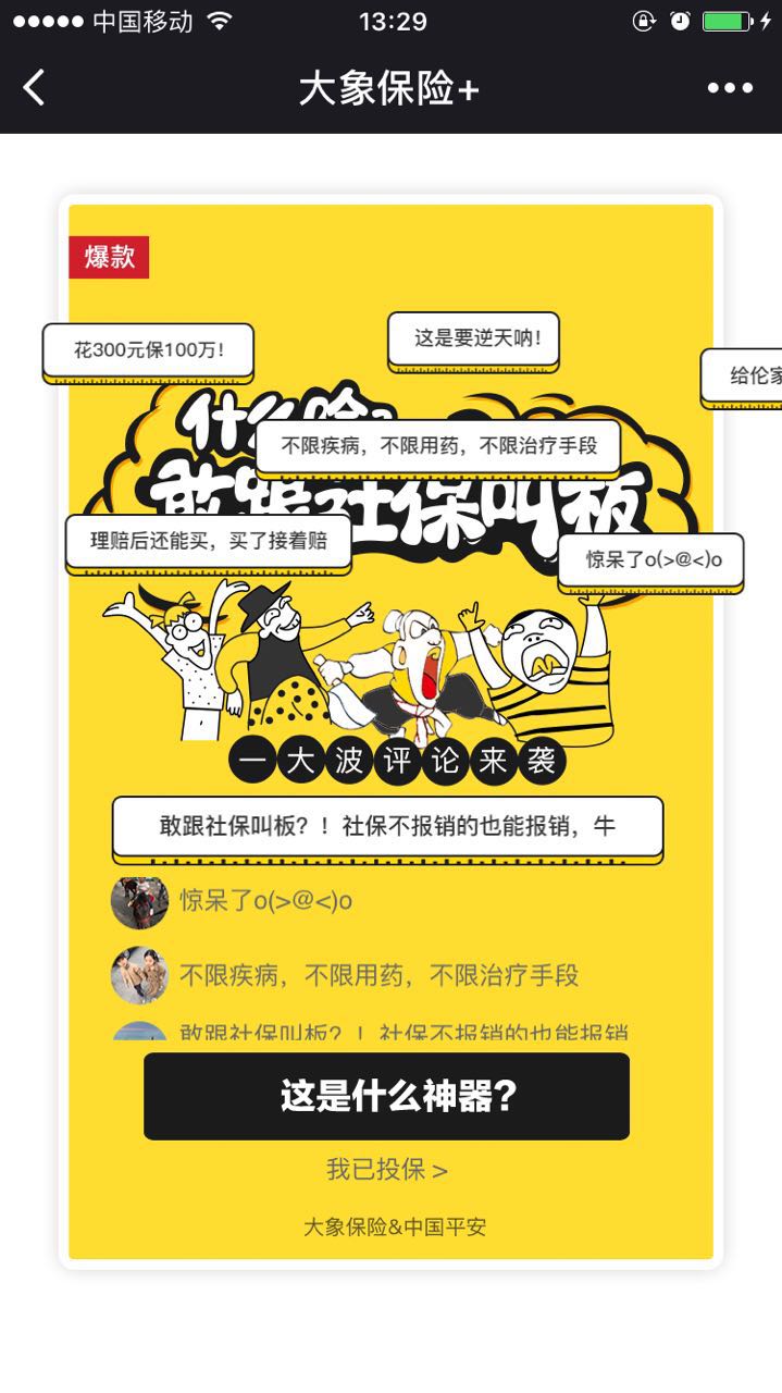 1.只为你准备一个28天到60岁都需要的爆款保障,教你撸出100万 2.专家说什么不重要,用户们告诉你什么是保险界的清流 3.为全家保障不麻烦,3分钟完成全家人的专属保护 4.需要帮助?微信客服妹纸等你来撩~