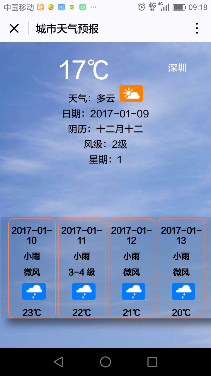 城市天气预报是一款天气查询小程序,目前支持300个城市最近5天天气的查询。