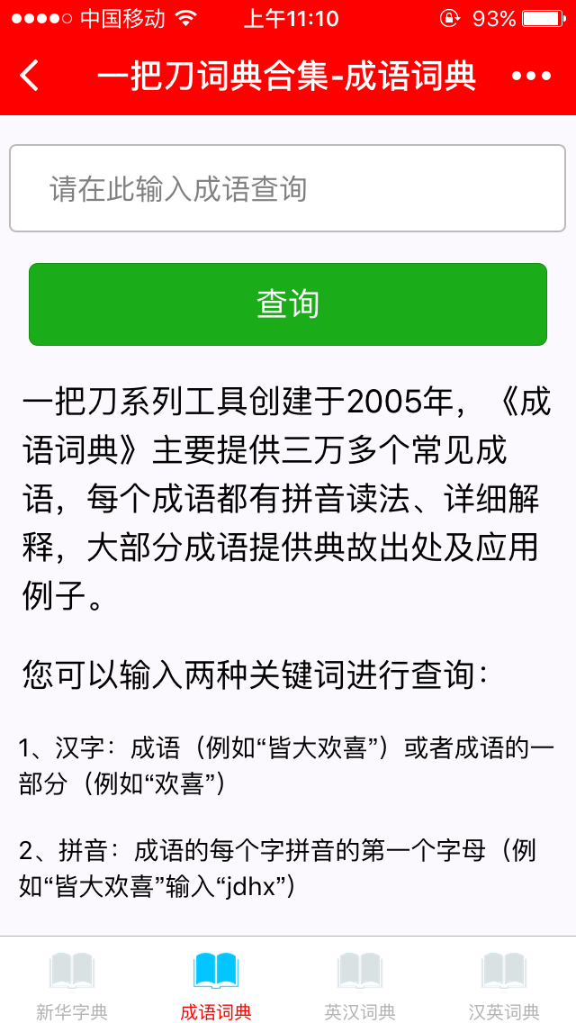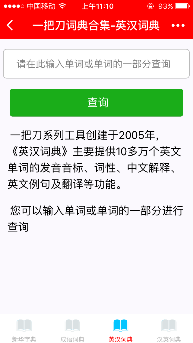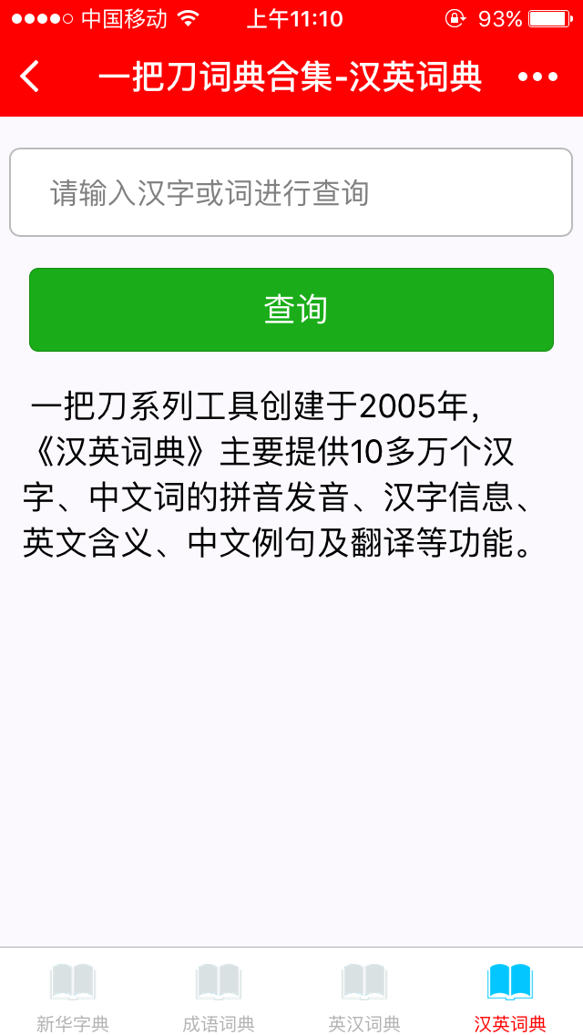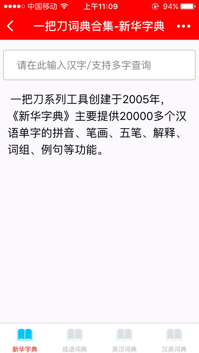 一把刀词典合集,包含了一把刀新华字典、一把刀成语词典、一把刀英汉词典、一把刀汉英词典四个小程序的组合功能。