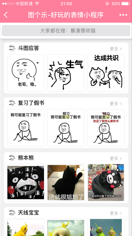 暴漫卡通动画明星表情,聊天必备斗图首选。只有你想不到的,没有你找不到的! 更多功能,尽在图个乐。