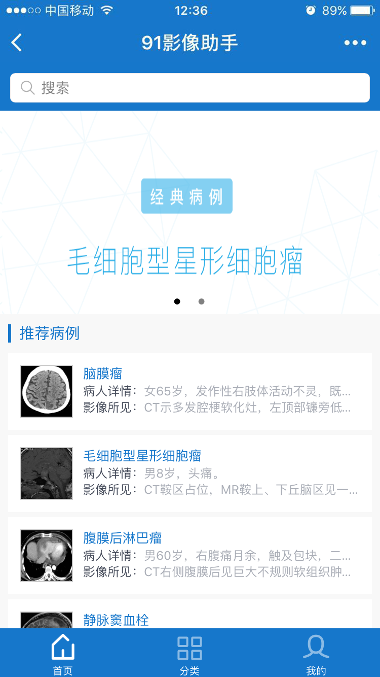 「91影像助手」是一款医学影像查询工具,搭建了一个医学影像信息数据库,用户可以通过点击分类菜单栏、输入关键词搜索查询医学影像的相关内容。「91影像助手」隶属于杭州至临医疗科技有限公司(以下简称”至临医疗科技”),主要为医生群体提供系统化、便捷化的医学影像信息查询服务。 医生在工作和学习中遇到需要查询资料的情况时,可以通过检索「91影像助手」来获取相关信息。